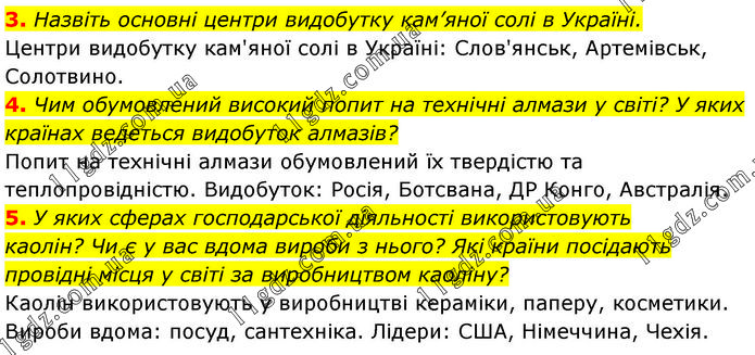 3. Назвіть основні центри видобутку кам’яної солі в Україні. Центри видобутку кам'яної солі в Україні: Слов'янськ, Артемівськ, Солотвино. 4. Чим обумовлений високий попит на технічні алмази у світі? У яких країнах ведеться видобуток алмазів? Попит на технічні алмази обумовлений їх твердістю та теплопровідністю. Видобуток: Росія, Ботсвана, ДР Конго, Австралія. 5. У яких сферах господарської діяльності використовують каолін? Чи є у вас вдома вироби з нього? Які країни посідають провідні місця у світі за виробництвом каоліну? Каолін використовують у виробництві кераміки, паперу, косметики. Вироби вдома: посуд, сантехніка. Лідери: США, Німеччина, Чехія.
