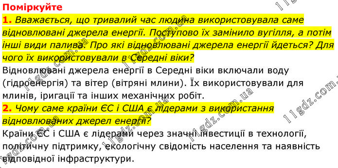 Поміркуйте 1. Вважається, що тривалий час людина використовувала саме відновлювані джерела енергії. Поступово їх замінило вугілля, а потім інші види палива. Про які відновлювані джерела енергії йдеться? Для чого їх використовували в Середні віки? Відновлювані джерела енергії в Середні віки включали воду (гідроенергія) та вітер (вітряні млини). Їх використовували для млинів, іригації та інших механічних робіт. 2. Чому саме країни ЄС і США є лідерами з використання відновлюваних джерел енергії? Країни ЄС і США є лідерами через значні інвестиції в технології, політичну підтримку, екологічну свідомість населення та наявність відповідної інфраструктури.
