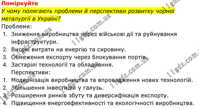 Поміркуйте У чому полягають проблеми й перспективи розвитку чорної металургії в Україні? Проблеми: 1. Зниження виробництва через військові дії та руйнування інфраструктури. 2. Високі витрати на енергію та сировину. 3. Обмеження експорту через блокування портів. 4. Застарілі технології та обладнання. Перспективи: 1. Модернізація виробництва та впровадження нових технологій. 2. Збільшення інвестицій у галузь. 3. Розширення ринків збуту та диверсифікація експорту. 4. Підвищення енергоефективності та екологічності виробництва.