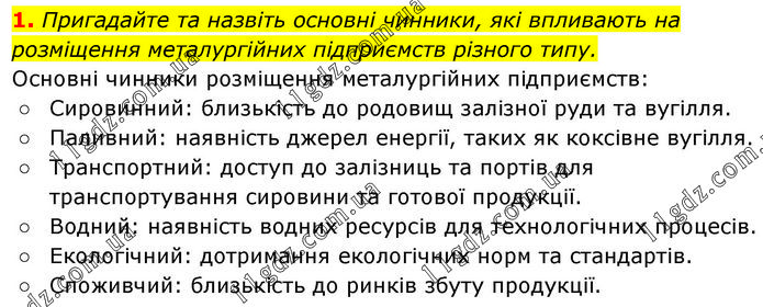 1. Пригадайте та назвіть основні чинники, які впливають на розміщення металургійних підприємств різного типу. Основні чинники розміщення металургійних підприємств: ○ Сировинний: близькість до родовищ залізної руди та вугілля. ○ Паливний: наявність джерел енергії, таких як коксівне вугілля. ○ Транспортний: доступ до залізниць та портів для транспортування сировини та готової продукції. ○ Водний: наявність водних ресурсів для технологічних процесів. ○ Екологічний: дотримання екологічних норм та стандартів. ○ Споживчий: близькість до ринків збуту продукції.