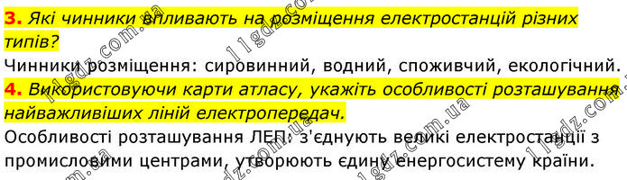 3. Які чинники впливають на розміщення електростанцій різних типів? Чинники розміщення: сировинний, водний, споживчий, екологічний. 4. Використовуючи карти атласу, укажіть особливості розташування найважливіших ліній електропередач. Особливості розташування ЛЕП: з'єднують великі електростанції з промисловими центрами, утворюють єдину енергосистему країни.