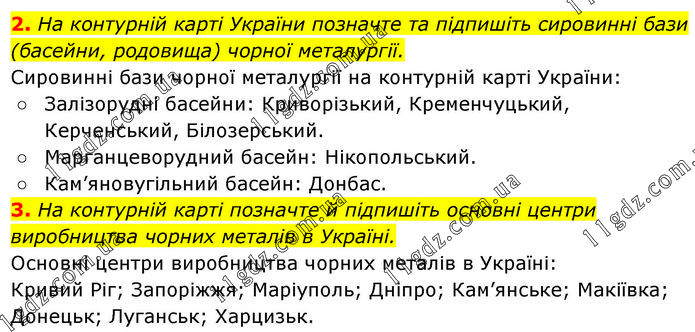 2. На контурній карті України позначте та підпишіть сировинні бази (басейни, родовища) чорної металургії. Сировинні бази чорної металургії на контурній карті України: ○ Залізорудні басейни: Криворізький, Кременчуцький, Керченський, Білозерський. ○ Марганцеворудний басейн: Нікопольський. ○ Кам’яновугільний басейн: Донбас. 3. На контурній карті позначте й підпишіть основні центри виробництва чорних металів в Україні. Основні центри виробництва чорних металів в Україні: Кривий Ріг; Запоріжжя; Маріуполь; Дніпро; Кам’янське; Макіївка; Донецьк; Луганськ; Харцизьк.