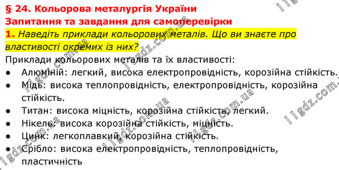 § 24. Кольорова металургія України Запитання та завдання для самоперевірки 1. Наведіть приклади кольорових металів. Що ви знаєте про властивості окремих із них? Приклади кольорових металів та їх властивості: ● Алюміній: легкий, висока електропровідність, корозійна стійкість. ● Мідь: висока теплопровідність, електропровідність, корозійна стійкість. ● Титан: висока міцність, корозійна стійкість, легкий. ● Нікель: висока корозійна стійкість, міцність. ● Цинк: легкоплавкий, корозійна стійкість. ● Срібло: висока електропровідність, теплопровідність, пластичність