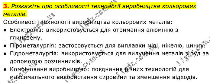 3. Розкажіть про особливості технології виробництва кольорових металів. Особливості технології виробництва кольорових металів: ● Електроліз: використовується для отримання алюмінію з глинозему. ● Пірометалургія: застосовується для виплавки міді, нікелю, цинку. ● Гідрометалургія: використовується для вилучення металів з руд за допомогою розчинників. ● Комбіноване виробництво: поєднання різних технологій для максимального використання сировини та зменшення відходів.