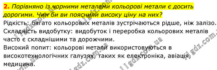 2. Порівняно із чорними металами кольорові метали є досить дорогими. Чим би ви пояснили високу ціну на них? Рідкість: багато кольорових металів зустрічаються рідше, ніж залізо. Складність видобутку: видобуток і переробка кольорових металів часто є складнішими та дорожчими. Високий попит: кольорові метали використовуються в високотехнологічних галузях, таких як електроніка, авіація, медицина.