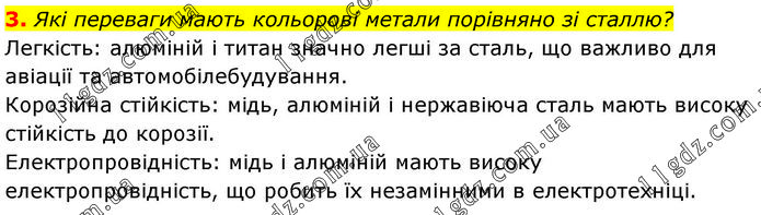 3. Які переваги мають кольорові метали порівняно зі сталлю? Легкість: алюміній і титан значно легші за сталь, що важливо для авіації та автомобілебудування. Корозійна стійкість: мідь, алюміній і нержавіюча сталь мають високу стійкість до корозії. Електропровідність: мідь і алюміній мають високу електропровідність, що робить їх незамінними в електротехніці.