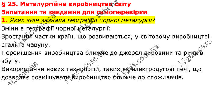 § 25. Металургійне виробництво світу Запитання та завдання для самоперевірки 1. Яких змін зазнала географія чорної металургії? Зміни в географії чорної металургії: Зростання частки країн, що розвиваються, у світовому виробництві сталі та чавуну. Переміщення виробництва ближче до джерел сировини та ринків збуту. Використання нових технологій, таких як електродугові печі, що дозволяє розміщувати виробництво ближче до споживачів.