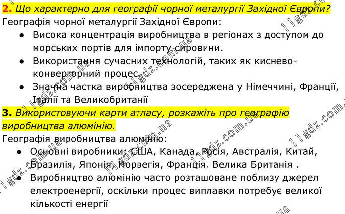 2. Що характерно для географії чорної металургії Західної Європи? Географія чорної металургії Західної Європи: ● Висока концентрація виробництва в регіонах з доступом до морських портів для імпорту сировини. ● Використання сучасних технологій, таких як киснево-конверторний процес. ● Значна частка виробництва зосереджена у Німеччині, Франції, Італії та Великобританії 3. Використовуючи карти атласу, розкажіть про географію виробництва алюмінію. Географія виробництва алюмінію: ● Основні виробники: США, Канада, Росія, Австралія, Китай, Бразилія, Японія, Норвегія, Франція, Велика Британія . ● Виробництво алюмінію часто розташоване поблизу джерел електроенергії, оскільки процес виплавки потребує великої кількості енергії