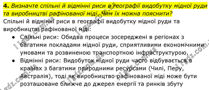 4. Визначте спільні й відмінні риси в географії видобутку мідної руди та виробництві рафінованої міді. Чим їх можна пояснити? Спільні й відмінні риси в географії видобутку мідної руди та виробництві рафінованої міді: ● Спільні риси: Обидва процеси зосереджені в регіонах з багатими покладами мідної руди, сприятливими економічними умовами та розвиненою транспортною інфраструктурою. ● Відмінні риси: Видобуток мідної руди часто відбувається в країнах з багатими природними ресурсами (Чилі, Перу, Австралія), тоді як виробництво рафінованої міді може бути розташоване ближче до джерел енергії та ринків збуту