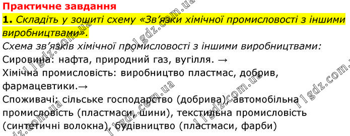 Практичне завдання 1. Складіть у зошиті схему «Зв’язки хімічної промисловості з іншими виробництвами». Схема зв’язків хімічної промисловості з іншими виробництвами: Сировина: нафта, природний газ, вугілля. → Хімічна промисловість: виробництво пластмас, добрив, фармацевтики.→ Споживачі: сільське господарство (добрива), автомобільна промисловість (пластмаси, шини), текстильна промисловість (синтетичні волокна), будівництво (пластмаси, фарби)