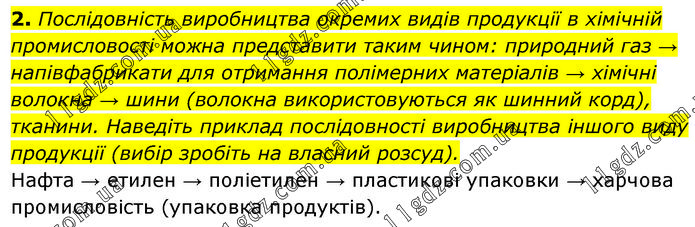 2. Послідовність виробництва окремих видів продукції в хімічній промисловості можна представити таким чином: природний газ → напівфабрикати для отримання полімерних матеріалів → хімічні волокна → шини (волокна використовуються як шинний корд), тканини. Наведіть приклад послідовності виробництва іншого виду продукції (вибір зробіть на власний розсуд). Нафта → етилен → поліетилен → пластикові упаковки → харчова промисловість (упаковка продуктів).
