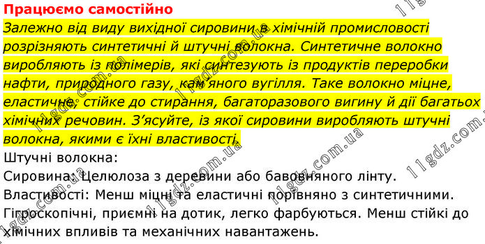 Працюємо самостійно Залежно від виду вихідної сировини в хімічній промисловості розрізняють синтетичні й штучні волокна. Синтетичне волокно виробляють із полімерів, які синтезують із продуктів переробки нафти, природного газу, кам’яного вугілля. Таке волокно міцне, еластичне, стійке до стирання, багаторазового вигину й дії багатьох хімічних речовин. З’ясуйте, із якої сировини виробляють штучні волокна, якими є їхні властивості. Штучні волокна: Сировина: Целюлоза з деревини або бавовняного лінту. Властивості: Менш міцні та еластичні порівняно з синтетичними. Гігроскопічні, приємні на дотик, легко фарбуються. Менш стійкі до хімічних впливів та механічних навантажень.