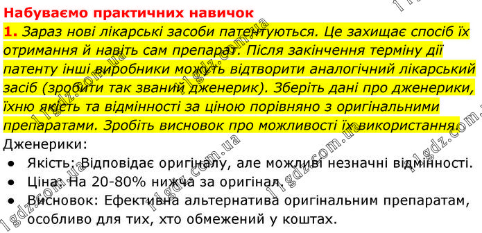 Набуваємо практичних навичок 1. Зараз нові лікарські засоби патентуються. Це захищає спосіб їх отримання й навіть сам препарат. Після закінчення терміну дії патенту інші виробники можуть відтворити аналогічний лікарський засіб (зробити так званий дженерик). Зберіть дані про дженерики, їхню якість та відмінності за ціною порівняно з оригінальними препаратами. Зробіть висновок про можливості їх використання. Дженерики: ● Якість: Відповідає оригіналу, але можливі незначні відмінності. ● Ціна: На 20-80% нижча за оригінал. ● Висновок: Ефективна альтернатива оригінальним препаратам, особливо для тих, хто обмежений у коштах.
