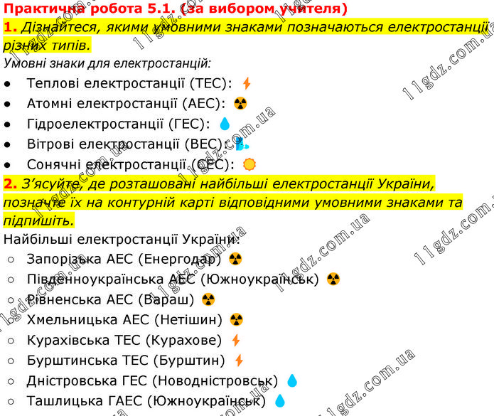 Практична робота 5.1. (за вибором учителя) 1. Дізнайтеся, якими умовними знаками позначаються електростанції різних типів. Умовні знаки для електростанцій: ● Теплові електростанції (ТЕС): ⚡ ● Атомні електростанції (АЕС): ☢️ ● Гідроелектростанції (ГЕС): 💧 ● Вітрові електростанції (ВЕС): 🌬️ ● Сонячні електростанції (СЕС): ☀️ 2. З’ясуйте, де розташовані найбільші електростанції України, позначте їх на контурній карті відповідними умовними знаками та підпишіть. Найбільші електростанції України: ○ Запорізька АЕС (Енергодар) ☢️ ○ Південноукраїнська АЕС (Южноукраїнськ) ☢️ ○ Рівненська АЕС (Вараш) ☢️ ○ Хмельницька АЕС (Нетішин) ☢️ ○ Курахівська ТЕС (Курахове) ⚡ ○ Бурштинська ТЕС (Бурштин) ⚡ ○ Дністровська ГЕС (Новодністровськ) 💧 ○ Ташлицька ГАЕС (Южноукраїнськ) 💧