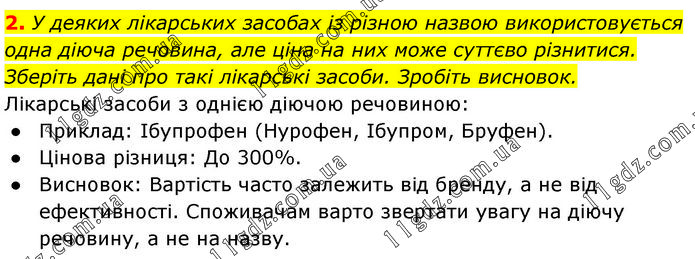 2. У деяких лікарських засобах із різною назвою використовується одна діюча речовина, але ціна на них може суттєво різнитися. Зберіть дані про такі лікарські засоби. Зробіть висновок. Лікарські засоби з однією діючою речовиною: ● Приклад: Ібупрофен (Нурофен, Ібупром, Бруфен). ● Цінова різниця: До 300%. ● Висновок: Вартість часто залежить від бренду, а не від ефективності. Споживачам варто звертати увагу на діючу речовину, а не на назву.