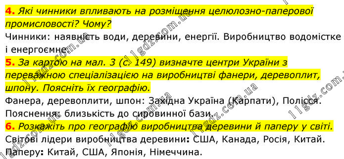 4. Які чинники впливають на розміщення целюлозно-паперової промисловості? Чому? Чинники: наявність води, деревини, енергії. Виробництво водомістке і енергоємне. 5. За картою на мал. 3 (с. 149) визначте центри України з переважною спеціалізацією на виробництві фанери, деревоплит, шпону. Поясніть їх географію. Фанера, деревоплити, шпон: Західна Україна (Карпати), Полісся. Пояснення: близькість до сировинної бази. 6. Розкажіть про географію виробництва деревини й паперу у світі. Світові лідери виробництва деревини: США, Канада, Росія, Китай. Паперу: Китай, США, Японія, Німеччина.