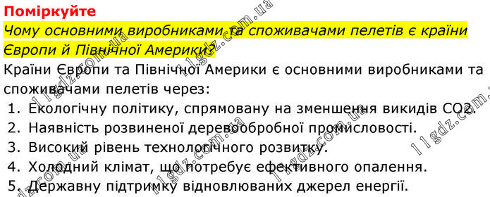 Поміркуйте Чому основними виробниками та споживачами пелетів є країни Європи й Північної Америки? Країни Європи та Північної Америки є основними виробниками та споживачами пелетів через: 1. Екологічну політику, спрямовану на зменшення викидів CO2. 2. Наявність розвиненої деревообробної промисловості. 3. Високий рівень технологічного розвитку. 4. Холодний клімат, що потребує ефективного опалення. 5. Державну підтримку відновлюваних джерел енергії.