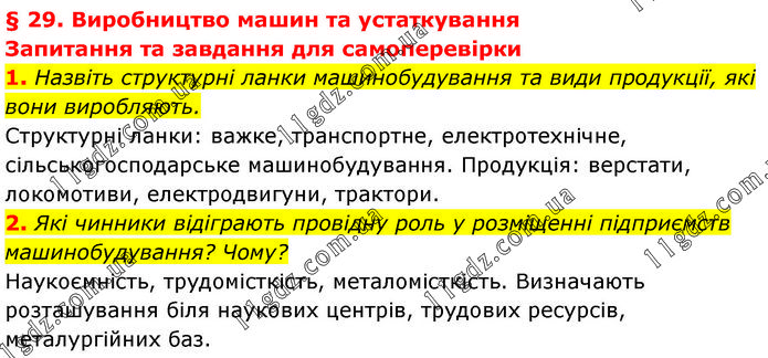§ 29. Виробництво машин та устаткування Запитання та завдання для самоперевірки 1. Назвіть структурні ланки машинобудування та види продукції, які вони виробляють. Структурні ланки: важке, транспортне, електротехнічне, сільськогосподарське машинобудування. Продукція: верстати, локомотиви, електродвигуни, трактори. 2. Які чинники відіграють провідну роль у розміщенні підприємств машинобудування? Чому? Наукоємність, трудомісткість, металомісткість. Визначають розташування біля наукових центрів, трудових ресурсів, металургійних баз.