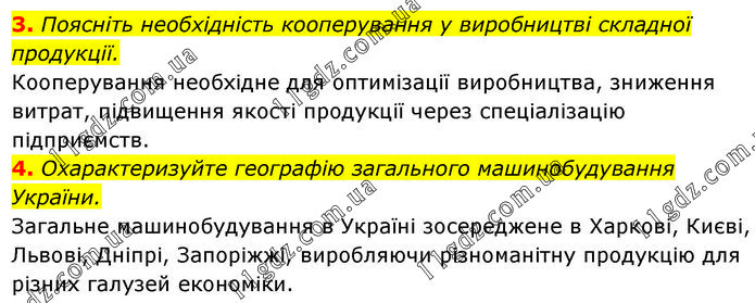 3. Поясніть необхідність кооперування у виробництві складної продукції. Кооперування необхідне для оптимізації виробництва, зниження витрат, підвищення якості продукції через спеціалізацію підприємств. 4. Охарактеризуйте географію загального машинобудування України. Загальне машинобудування в Україні зосереджене в Харкові, Києві, Львові, Дніпрі, Запоріжжі, виробляючи різноманітну продукцію для різних галузей економіки.