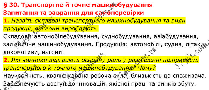 § 30. Транспортне й точне машинобудування Запитання та завдання для самоперевірки 1. Назвіть складові транспортного машинобудування та види продукції, які вони виробляють. Складові: автомобілебудування, суднобудування, авіабудування, залізничне машинобудування. Продукція: автомобілі, судна, літаки, локомотиви, вагони. 2. Які чинники відіграють основну роль у розміщенні підприємств транспортного й точного машинобудування? Чому? Наукоємність, кваліфікована робоча сила, близькість до споживача. Забезпечують доступ до інновацій, якісної праці та ринків збуту.