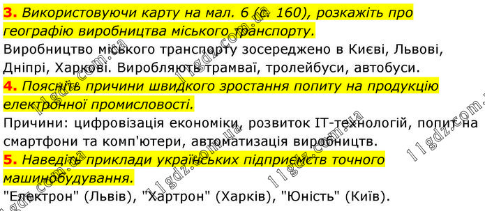 3. Використовуючи карту на мал. 6 (с. 160), розкажіть про географію виробництва міського транспорту. Виробництво міського транспорту зосереджено в Києві, Львові, Дніпрі, Харкові. Виробляють трамваї, тролейбуси, автобуси. 4. Поясніть причини швидкого зростання попиту на продукцію електронної промисловості. Причини: цифровізація економіки, розвиток ІТ-технологій, попит на смартфони та комп'ютери, автоматизація виробництв. 5. Наведіть приклади українських підприємств точного машинобудування. "Електрон" (Львів), "Хартрон" (Харків), "Юність" (Київ).