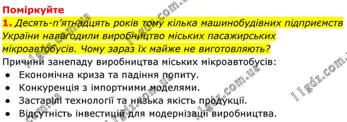 Поміркуйте 1. Десять-п’ятнадцять років тому кілька машинобудівних підприємств України налагодили виробництво міських пасажирських мікроавтобусів. Чому зараз їх майже не виготовляють? Причини занепаду виробництва міських мікроавтобусів: ● Економічна криза та падіння попиту. ● Конкуренція з імпортними моделями. ● Застарілі технології та низька якість продукції. ● Відсутність інвестицій для модернізації виробництва.