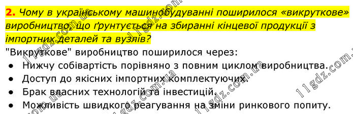 2. Чому в українському машинобудуванні поширилося «викруткове» виробництво, що ґрунтується на збиранні кінцевої продукції з імпортних деталей та вузлів? "Викруткове" виробництво поширилося через: ● Нижчу собівартість порівняно з повним циклом виробництва. ● Доступ до якісних імпортних комплектуючих. ● Брак власних технологій та інвестицій. ● Можливість швидкого реагування на зміни ринкового попиту.