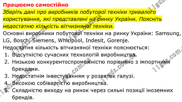 Працюємо самостійно Зберіть дані про виробників побутової техніки тривалого користування, які представлені на ринку України. Поясніть недостатню кількість вітчизняної техніки. Основні виробники побутової техніки на ринку України: Samsung, LG, Bosch, Siemens, Whirlpool, Indesit, Gorenje. Недостатня кількість вітчизняної техніки пояснюється: 1. Відсутністю сучасних технологій виробництва. 2. Низькою конкурентоспроможністю порівняно з імпортними брендами. 3. Недостатнім інвестуванням у розвиток галузі. 4. Високою собівартістю виробництва. 5. Складністю в