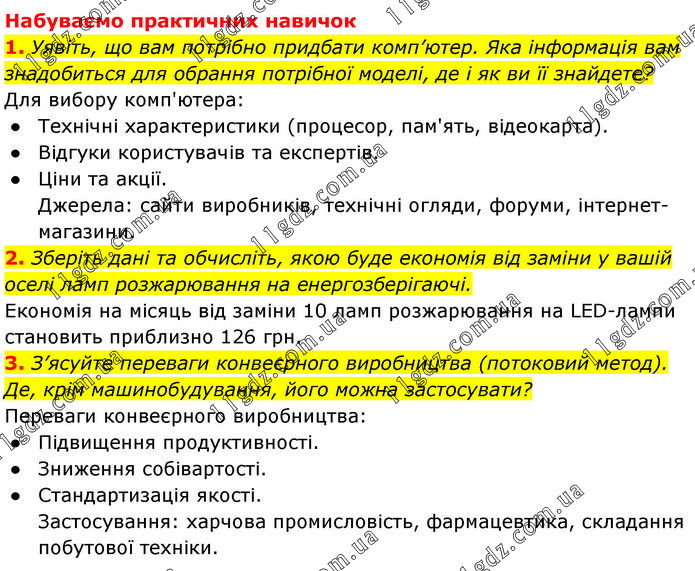 Набуваємо практичних навичок 1. Уявіть, що вам потрібно придбати комп’ютер. Яка інформація вам знадобиться для обрання потрібної моделі, де і як ви її знайдете? Для вибору комп'ютера: ● Технічні характеристики (процесор, пам'ять, відеокарта). ● Відгуки користувачів та експертів. ● Ціни та акції. Джерела: сайти виробників, технічні огляди, форуми, інтернет-магазини. 2. Зберіть дані та обчисліть, якою буде економія від заміни у вашій оселі ламп розжарювання на енергозберігаючі. Економія на місяць від заміни 10 ламп розжарювання на LED-лампи становить приблизно 126 грн. 3. З’ясуйте переваги конвеєрного виробництва (потоковий метод). Де, крім машинобудування, його можна застосувати? Переваги конвеєрного виробництва: ● Підвищення продуктивності. ● Зниження собівартості. ● Стандартизація якості. Застосування: харчова промисловість, фармацевтика, складання побутової техніки.