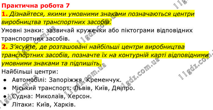 Практична робота 7 1. Дізнайтеся, якими умовними знаками позначаються центри виробництва транспортних засобів. Умовні знаки: зазвичай кружечки або піктограми відповідних транспортних засобів. 2. З’ясуйте, де розташовані найбільші центри виробництва транспортних засобів, позначте їх на контурній карті відповідними умовними знаками та підпишіть. Найбільші центри: ● Автомобілі: Запоріжжя, Кременчук. ● Міський транспорт: Львів, Київ, Дніпро. ● Судна: Миколаїв, Херсон. ● Літаки: Київ, Харків.