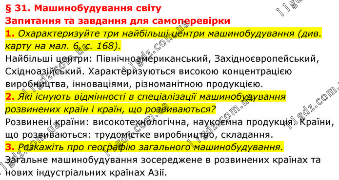 § 31. Машинобудування світу Запитання та завдання для самоперевірки 1. Охарактеризуйте три найбільші центри машинобудування (див. карту на мал. 6, с. 168). Найбільші центри: Північноамериканський, Західноєвропейський, Східноазійський. Характеризуються високою концентрацією виробництва, інноваціями, різноманітною продукцією. 2. Які існують відмінності в спеціалізації машинобудування розвинених країн і країн, що розвиваються? Розвинені країни: високотехнологічна, наукоємна продукція. Країни, що розвиваються: трудомістке виробництво, складання. 3. Розкажіть про географію загального машинобудування. Загальне машинобудування зосереджене в розвинених країнах та нових індустріальних країнах Азії.
