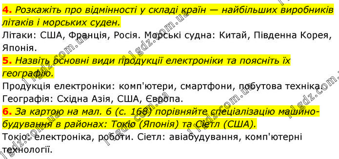 4. Розкажіть про відмінності у складі країн — найбільших виробників літаків і морських суден. Літаки: США, Франція, Росія. Морські судна: Китай, Південна Корея, Японія. 5. Назвіть основні види продукції електроніки та поясніть їх географію. Продукція електроніки: комп'ютери, смартфони, побутова техніка. Географія: Східна Азія, США, Європа. 6. За картою на мал. 6 (с. 168) порівняйте спеціалізацію машино-будування в районах: Токіо (Японія) та Сіетл (США). Токіо: електроніка, роботи. Сіетл: авіабудування, комп'ютерні технології.