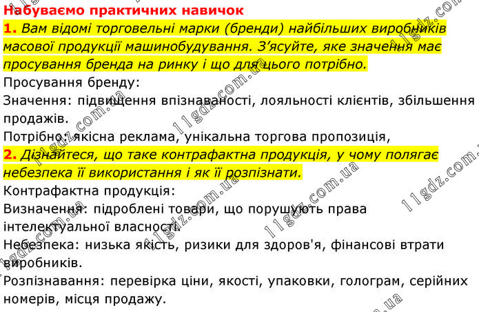 Набуваємо практичних навичок 1. Вам відомі торговельні марки (бренди) найбільших виробників масової продукції машинобудування. З’ясуйте, яке значення має просування бренда на ринку і що для цього потрібно. Просування бренду: Значення: підвищення впізнаваності, лояльності клієнтів, збільшення продажів. Потрібно: якісна реклама, унікальна торгова пропозиція, 2. Дізнайтеся, що таке контрафактна продукція, у чому полягає небезпека її використання і як її розпізнати. Контрафактна продукція: Визначення: підроблені товари, що порушують права інтелектуальної власності. Небезпека: низька якість, ризики для здоров'я, фінансові втрати виробників. Розпізнавання: перевірка ціни, якості, упаковки, голограм, серійних номерів, місця продажу.
