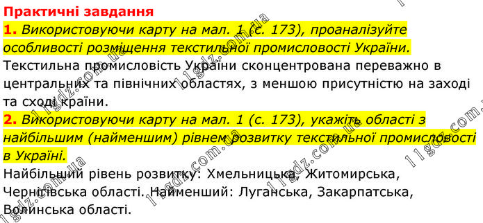 Практичні завдання 1. Використовуючи карту на мал. 1 (с. 173), проаналізуйте особливості розміщення текстильної промисловості України. Текстильна промисловість України сконцентрована переважно в центральних та північних областях, з меншою присутністю на заході та сході країни. 2. Використовуючи карту на мал. 1 (с. 173), укажіть області з найбільшим (найменшим) рівнем розвитку текстильної промисловості в Україні. Найбільший рівень розвитку: Хмельницька, Житомирська, Чернігівська області. Найменший: Луганська, Закарпатська, Волинська області.