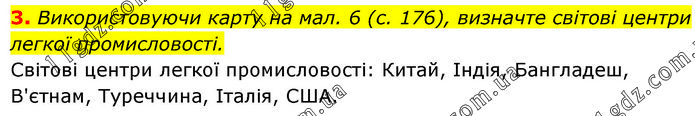 3. Використовуючи карту на мал. 6 (с. 176), визначте світові центри легкої промисловості. Світові центри легкої промисловості: Китай, Індія, Бангладеш, В'єтнам, Туреччина, Італія, США.