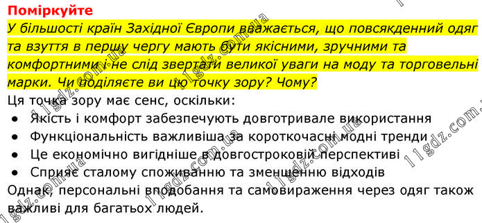 Поміркуйте У більшості країн Західної Європи вважається, що повсякденний одяг та взуття в першу чергу мають бути якісними, зручними та комфортними і не слід звертати великої уваги на моду та торговельні марки. Чи поділяєте ви цю точку зору? Чому? Ця точка зору має сенс, оскільки: ● Якість і комфорт забезпечують довготривале використання ● Функціональність важливіша за короткочасні модні тренди ● Це економічно вигідніше в довгостроковій перспективі ● Сприяє сталому споживанню та зменшенню відходів Однак, персональні вподобання та самовираження через одяг також важливі для багатьох людей.