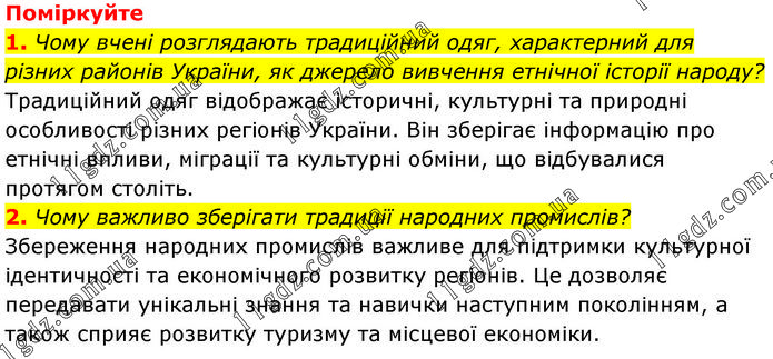 Поміркуйте 1. Чому вчені розглядають традиційний одяг, характерний для різних районів України, як джерело вивчення етнічної історії народу? Традиційний одяг відображає історичні, культурні та природні особливості різних регіонів України. Він зберігає інформацію про етнічні впливи, міграції та культурні обміни, що відбувалися протягом століть. 2. Чому важливо зберігати традиції народних промислів? Збереження народних промислів важливе для підтримки культурної ідентичності та економічного розвитку регіонів. Це дозволяє передавати унікальні знання та навички наступним поколінням, а також сприяє розвитку туризму та місцевої економіки.