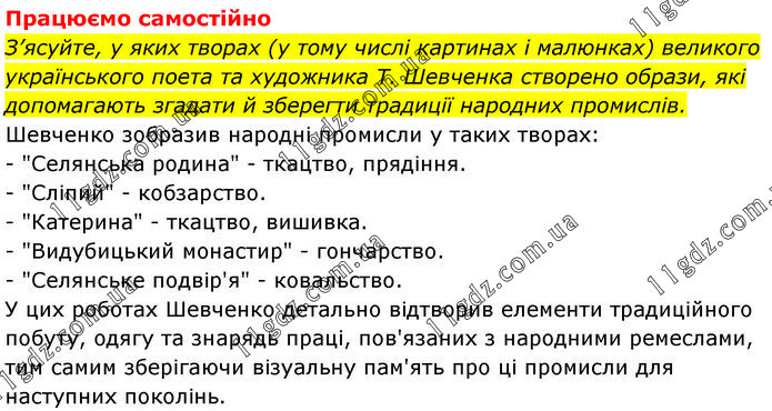 Працюємо самостійно З’ясуйте, у яких творах (у тому числі картинах і малюнках) великого українського поета та художника Т. Шевченка створено образи, які допомагають згадати й зберегти традиції народних промислів. Шевченко зобразив народні промисли у таких творах: - "Селянська родина" - ткацтво, прядіння. - "Сліпий" - кобзарство. - "Катерина" - ткацтво, вишивка. - "Видубицький монастир" - гончарство. - "Селянське подвір'я" - ковальство. У цих роботах Шевченко детально відтворив елементи традиційного побуту, одягу та знарядь праці, пов'язаних з народними ремеслами, тим самим зберігаючи візуальну пам'ять про ці промисли для наступних поколінь.