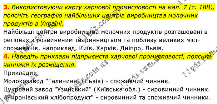 3. Використовуючи карту харчової промисловості на мал. 7 (с. 188), поясніть географію найбільших центрів виробництва молочних продуктів в Україні. Найбільші центри виробництва молочних продуктів розташовані в регіонах з розвиненим тваринництвом та поблизу великих міст-споживачів, наприклад, Київ, Харків, Дніпро, Львів. 4. Наведіть приклади підприємств харчової промисловості, поясніть чинники їх розміщення. Приклади: Молокозавод "Галичина" (Львів) - споживчий чинник. Цукровий завод "Узинський" (Київська обл.) - сировинний чинник. "Миронівський хлібопродукт" - сировинний та споживчий чинники.