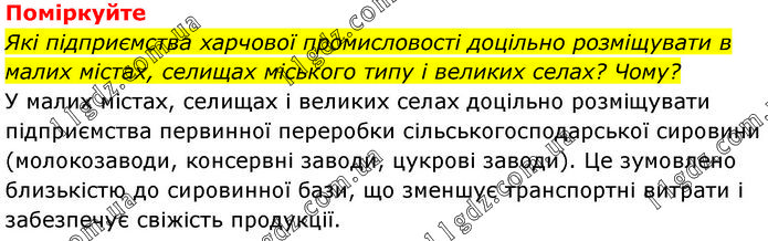 Поміркуйте Які підприємства харчової промисловості доцільно розміщувати в малих містах, селищах міського типу і великих селах? Чому? У малих містах, селищах і великих селах доцільно розміщувати підприємства первинної переробки сільськогосподарської сировини (молокозаводи, консервні заводи, цукрові заводи). Це зумовлено близькістю до сировинної бази, що зменшує транспортні витрати і забезпечує свіжість продукції.