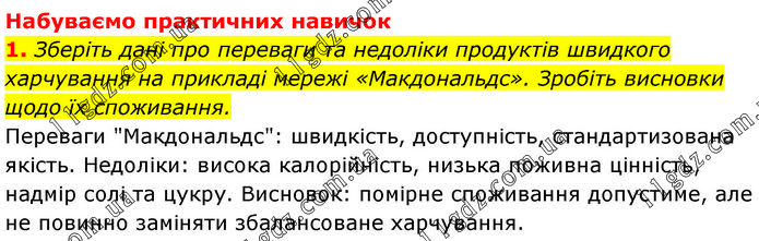 Набуваємо практичних навичок 1. Зберіть дані про переваги та недоліки продуктів швидкого харчування на прикладі мережі «Макдональдс». Зробіть висновки щодо їх споживання. Переваги "Макдональдс": швидкість, доступність, стандартизована якість. Недоліки: висока калорійність, низька поживна цінність, надмір солі та цукру. Висновок: помірне споживання допустиме, але не повинно заміняти збалансоване харчування.