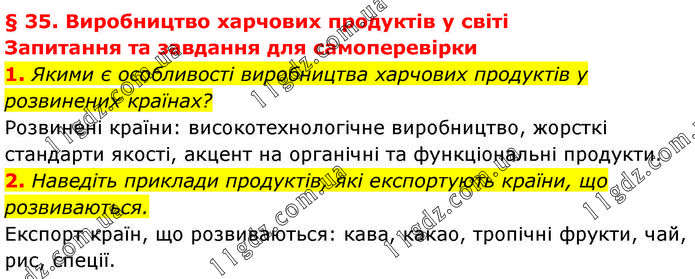 § 35. Виробництво харчових продуктів у світі Запитання та завдання для самоперевірки 1. Якими є особливості виробництва харчових продуктів у розвинених країнах? Розвинені країни: високотехнологічне виробництво, жорсткі стандарти якості, акцент на органічні та функціональні продукти. 2. Наведіть приклади продуктів, які експортують країни, що розвиваються. Експорт країн, що розвиваються: кава, какао, тропічні фрукти, чай, рис, спеції.