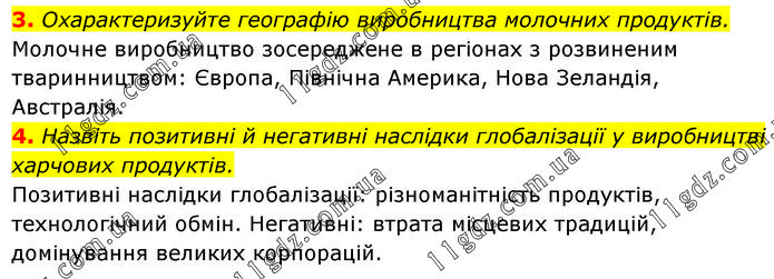 3. Охарактеризуйте географію виробництва молочних продуктів. Молочне виробництво зосереджене в регіонах з розвиненим тваринництвом: Європа, Північна Америка, Нова Зеландія, Австралія. 4. Назвіть позитивні й негативні наслідки глобалізації у виробництві харчових продуктів. Позитивні наслідки глобалізації: різноманітність продуктів, технологічний обмін. Негативні: втрата місцевих традицій, домінування великих корпорацій.