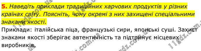 5. Наведіть приклади традиційних харчових продуктів у різних країнах світу. Поясніть, чому окремі з них захищені спеціальними знаками якості. Приклади: італійська піца, французькі сири, японські суші. Захист знаками якості зберігає автентичність та підтримує місцевих виробників.