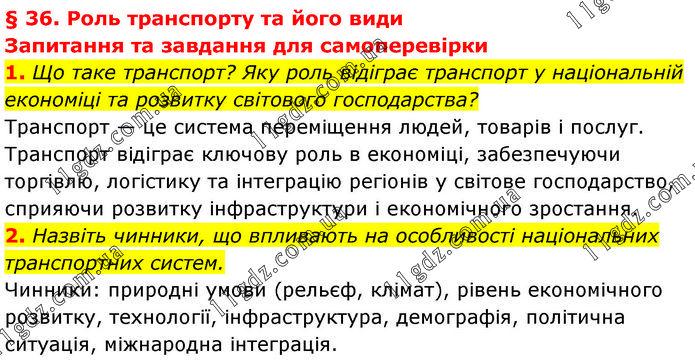 § 36. Роль транспорту та його види Запитання та завдання для самоперевірки 1. Що таке транспорт? Яку роль відіграє транспорт у національній економіці та розвитку світового господарства? Транспорт — це система переміщення людей, товарів і послуг. Транспорт відіграє ключову роль в економіці, забезпечуючи торгівлю, логістику та інтеграцію регіонів у світове господарство, сприяючи розвитку інфраструктури і економічного зростання. 2. Назвіть чинники, що впливають на особливості національних транспортних систем. Чинники: природні умови (рельєф, клімат), рівень економічного розвитку, технології, інфраструктура, демографія, політична ситуація, міжнародна інтеграція.