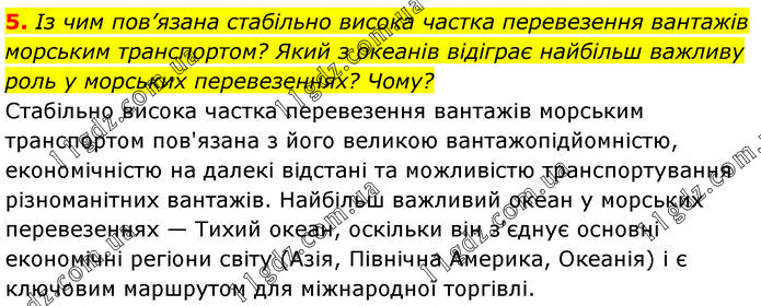 5. Із чим пов’язана стабільно висока частка перевезення вантажів морським транспортом? Який з океанів відіграє найбільш важливу роль у морських перевезеннях? Чому? Стабільно висока частка перевезення вантажів морським транспортом пов'язана з його великою вантажопідйомністю, економічністю на далекі відстані та можливістю транспортування різноманітних вантажів. Найбільш важливий океан у морських перевезеннях — Тихий океан, оскільки він з'єднує основні економічні регіони світу (Азія, Північна Америка, Океанія) і є ключовим маршрутом для міжнародної торгівлі.