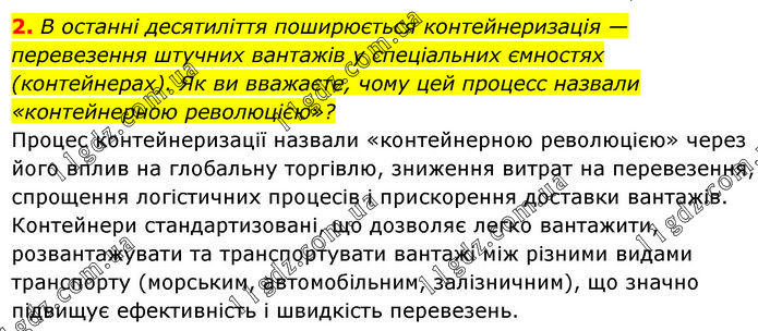 2. В останні десятиліття поширюється контейнеризація — перевезення штучних вантажів у спеціальних ємностях (контейнерах). Як ви вважаєте, чому цей процесс назвали «контейнерною революцією»? Процес контейнеризації назвали «контейнерною революцією» через його вплив на глобальну торгівлю, зниження витрат на перевезення, спрощення логістичних процесів і прискорення доставки вантажів. Контейнери стандартизовані, що дозволяє легко вантажити, розвантажувати та транспортувати вантажі між різними видами транспорту (морським, автомобільним, залізничним), що значно підвищує ефективність і швидкість перевезень.