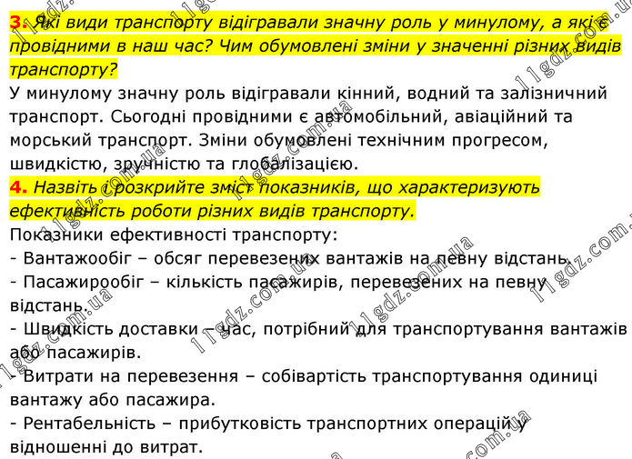 3. Які види транспорту відігравали значну роль у минулому, а які є провідними в наш час? Чим обумовлені зміни у значенні різних видів транспорту? У минулому значну роль відігравали кінний, водний та залізничний транспорт. Сьогодні провідними є автомобільний, авіаційний та морський транспорт. Зміни обумовлені технічним прогресом, швидкістю, зручністю та глобалізацією. 4. Назвіть і розкрийте зміст показників, що характеризують ефективність роботи різних видів транспорту. Показники ефективності транспорту: - Вантажообіг – обсяг перевезених вантажів на певну відстань. - Пасажирообіг – кількість пасажирів, перевезених на певну відстань. - Швидкість доставки – час, потрібний для транспортування вантажів або пасажирів. - Витрати на перевезення – собівартість транспортування одиниці вантажу або пасажира. - Рентабельність – прибутковість транспортних операцій у відношенні до витрат.