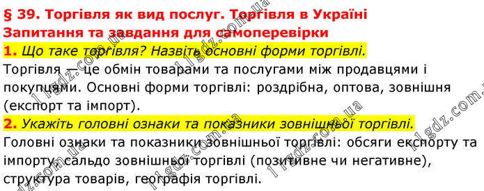 § 39. Торгівля як вид послуг. Торгівля в Україні Запитання та завдання для самоперевірки 1. Що таке торгівля? Назвіть основні форми торгівлі. Торгівля — це обмін товарами та послугами між продавцями і покупцями. Основні форми торгівлі: роздрібна, оптова, зовнішня (експорт та імпорт). 2. Укажіть головні ознаки та показники зовнішньої торгівлі. Головні ознаки та показники зовнішньої торгівлі: обсяги експорту та імпорту, сальдо зовнішньої торгівлі (позитивне чи негативне), структура товарів, географія торгівлі.