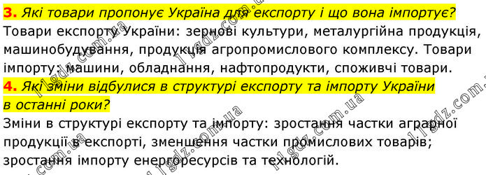 3. Які товари пропонує Україна для експорту і що вона імпортує? Товари експорту України: зернові культури, металургійна продукція, машинобудування, продукція агропромислового комплексу. Товари імпорту: машини, обладнання, нафтопродукти, споживчі товари. 4. Які зміни відбулися в структурі експорту та імпорту України в останні роки? Зміни в структурі експорту та імпорту: зростання частки аграрної продукції в експорті, зменшення частки промислових товарів; зростання імпорту енергоресурсів та технологій.